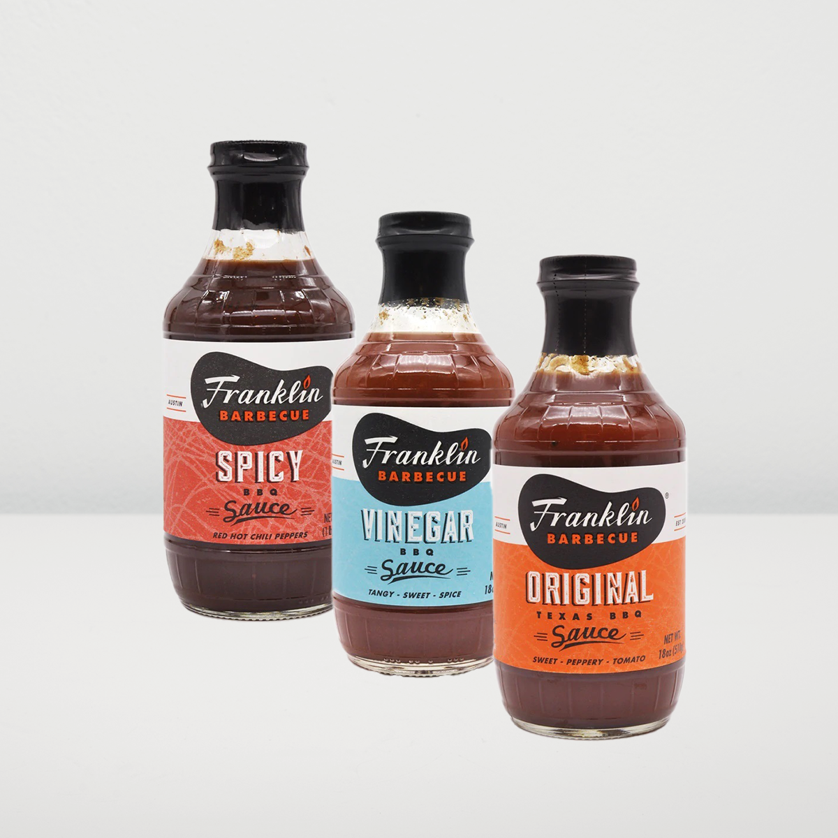 A Best of Franklin BBQ szósz csomag teljes texasi BBQ tapasztalatot ad: az Original egyensúlya, a Spicy tüzessége, a Vinegar frissessége együtt fedezi le minden grillezési igényt. Képzeld el a partin: vendégek kóstolják az Original gazdagságát, a Spicy melegségét, majd a Vinegar könnyedségét – igazi pitmaster hármas!