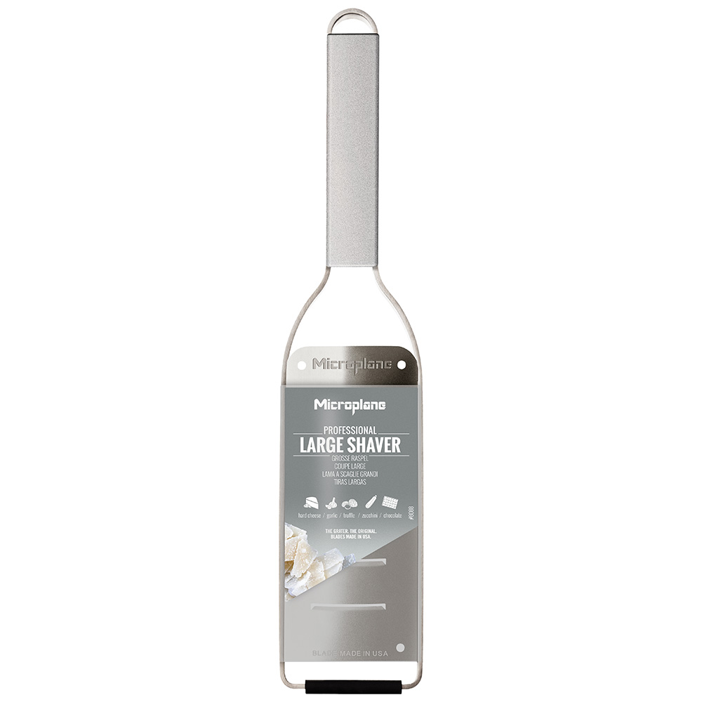 A Microplane Professional 2.0 Nagy Forgácsoló ultraéles rozsdamentes acél pengéivel és elegáns kialakításával tökéletes választás nagyobb méretű forgácsok készítésére sajtokból, csokoládéból vagy zöldségekből, miközben tartós és könnyen tisztítható.