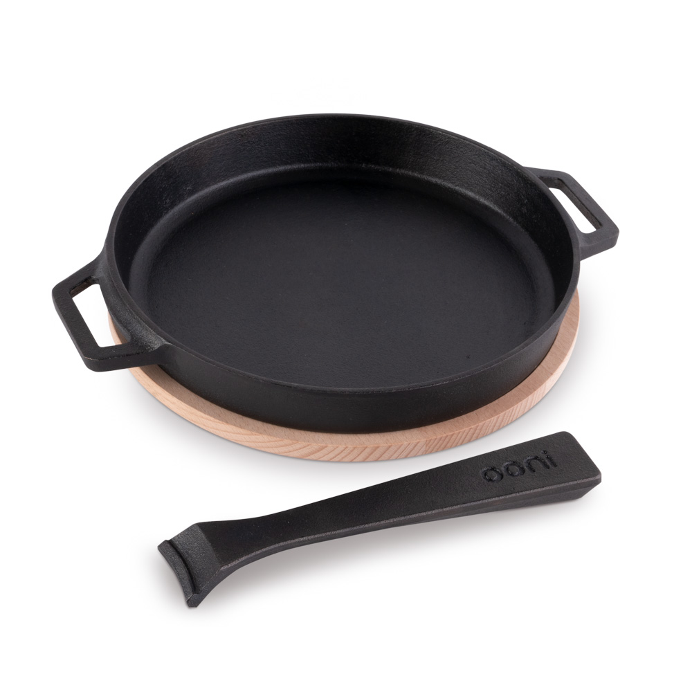 Az Ooni öntöttvas serpenyője minőségi, tartós öntöttvasból készült, kiváló hőmegtartási képességgel rendelkezik, ezért tökéletes „mindenes” serpenyő. Használhatod az Ooni sütődben, nyílt lángon vagy otthoni főzőlapon és sütőben is. Az egyedi könnyen lecsatolható nyele miatt nem fogod megégetni a kezed sem. Bükkfa tálalóval.