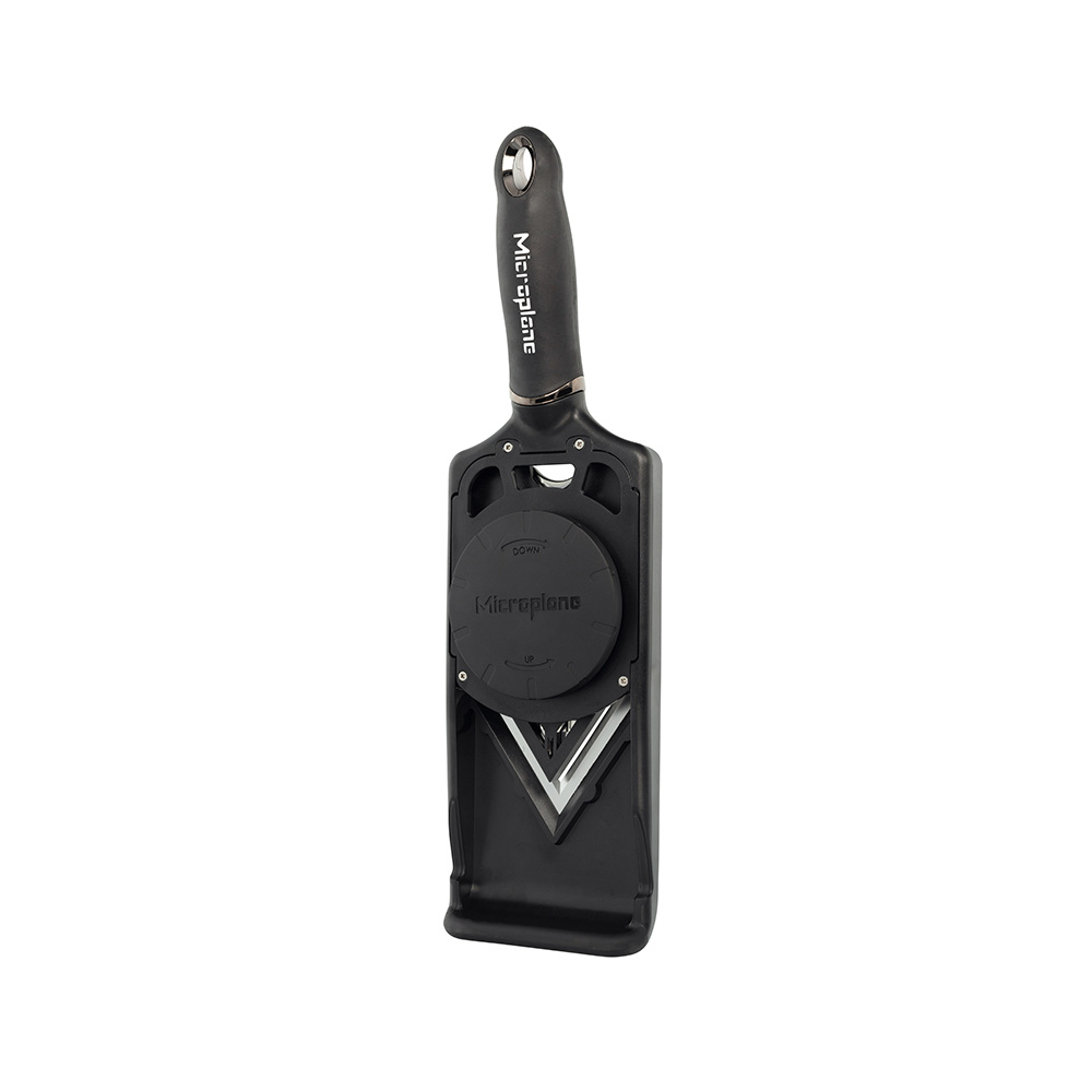 A Microplane V-Pengés Állítható Szeletelő Julienne Funkcióval egy sokoldalú konyhai eszköz, amely ultraéles rozsdamentes acél pengéivel precíz szeleteket és vékony julienne csíkokat készít, miközben ergonomikus kialakítása és csúszásmentes talpa kényelmes és biztonságos használatot biztosít.